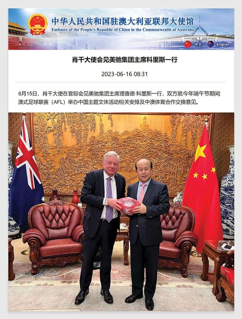 美驰澳大利亚资产管理部主席,前悉尼天鹅队主席Richard Colless先生于6月15日拜会肖千大使,就本活动相关安排及中澳体育合作交换意见。截图源自中国驻澳大利亚大使馆官网微信号。