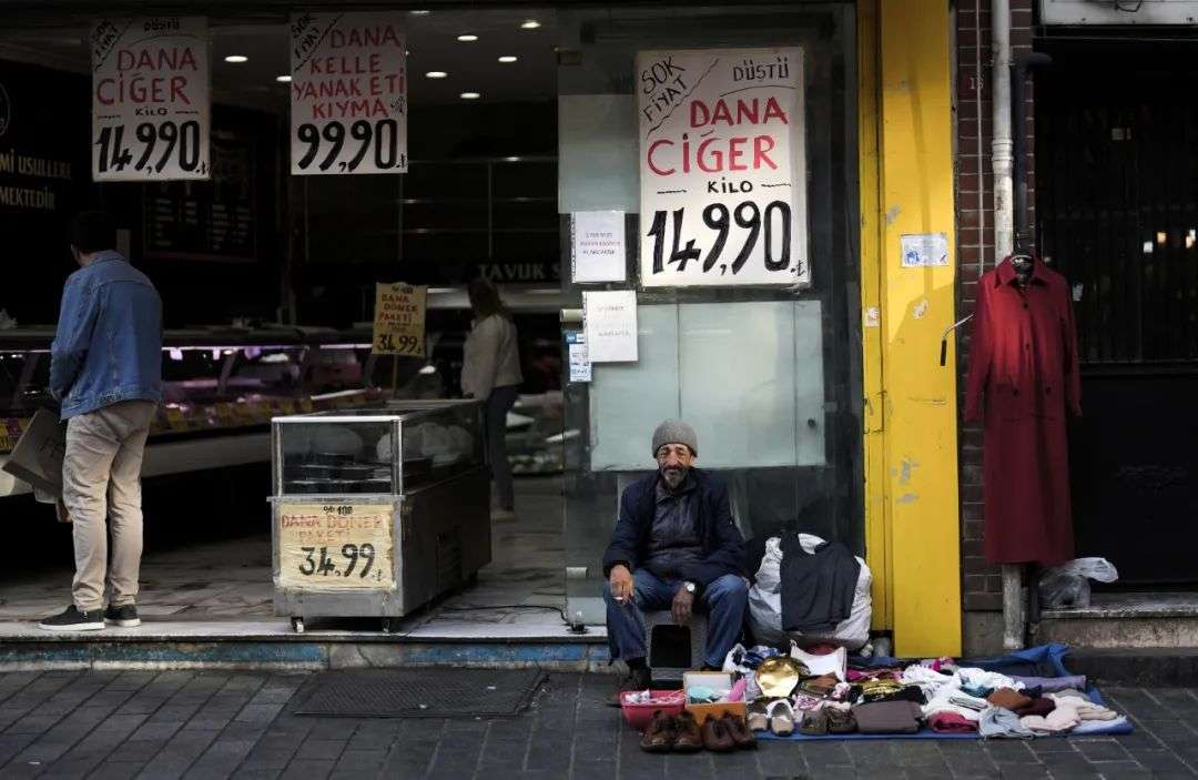 ▲资料图片:在土耳其伊斯坦布尔的一家肉铺门前,一名老人在摆摊卖衣服。(美联社)