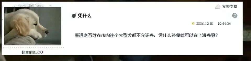 韩寒在自己的博客发文说:“普通老百姓在大城市内连个大型犬都不允许养,凭什么孙俪在上海养‘狼’都没人管?”