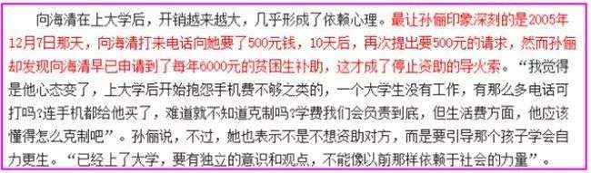 慢慢地也有更多消息说,那年去学校,孙俪妈妈实际是了解到向海清是学校的补助学生之一,一年可以收6000元的补助款。