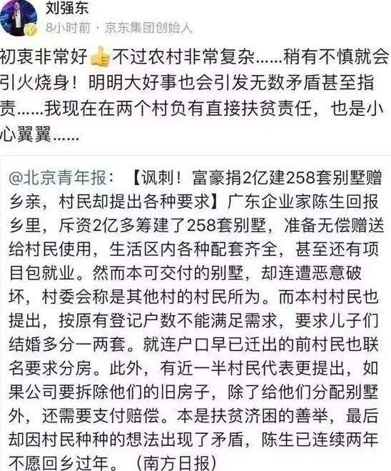 但是刘强东在一篇扶贫新闻下评论说:农村非常复杂,稍有不慎就会引火烧身,这么多年我都是小心翼翼。