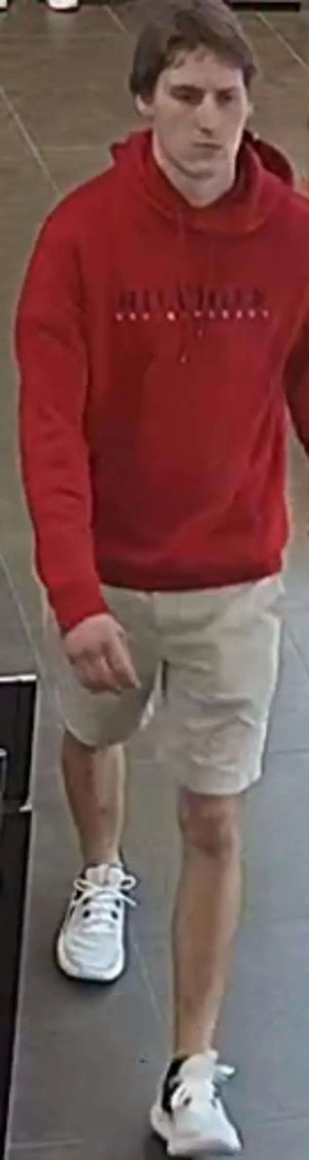 据描述,该男子皮肤白皙,大约20岁出头,身高在188厘米左右,淡棕色短发,穿着Tommy Hilfiger的红色连帽长袖套头衫,棕褐色及膝短裤,黑色腰带,黑白相间的跑步鞋和白色袜子。