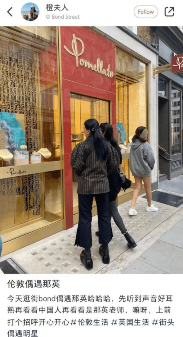 除了李湘一家,有网友还晒出了最近在伦敦偶遇那英和女儿逛街的照片。