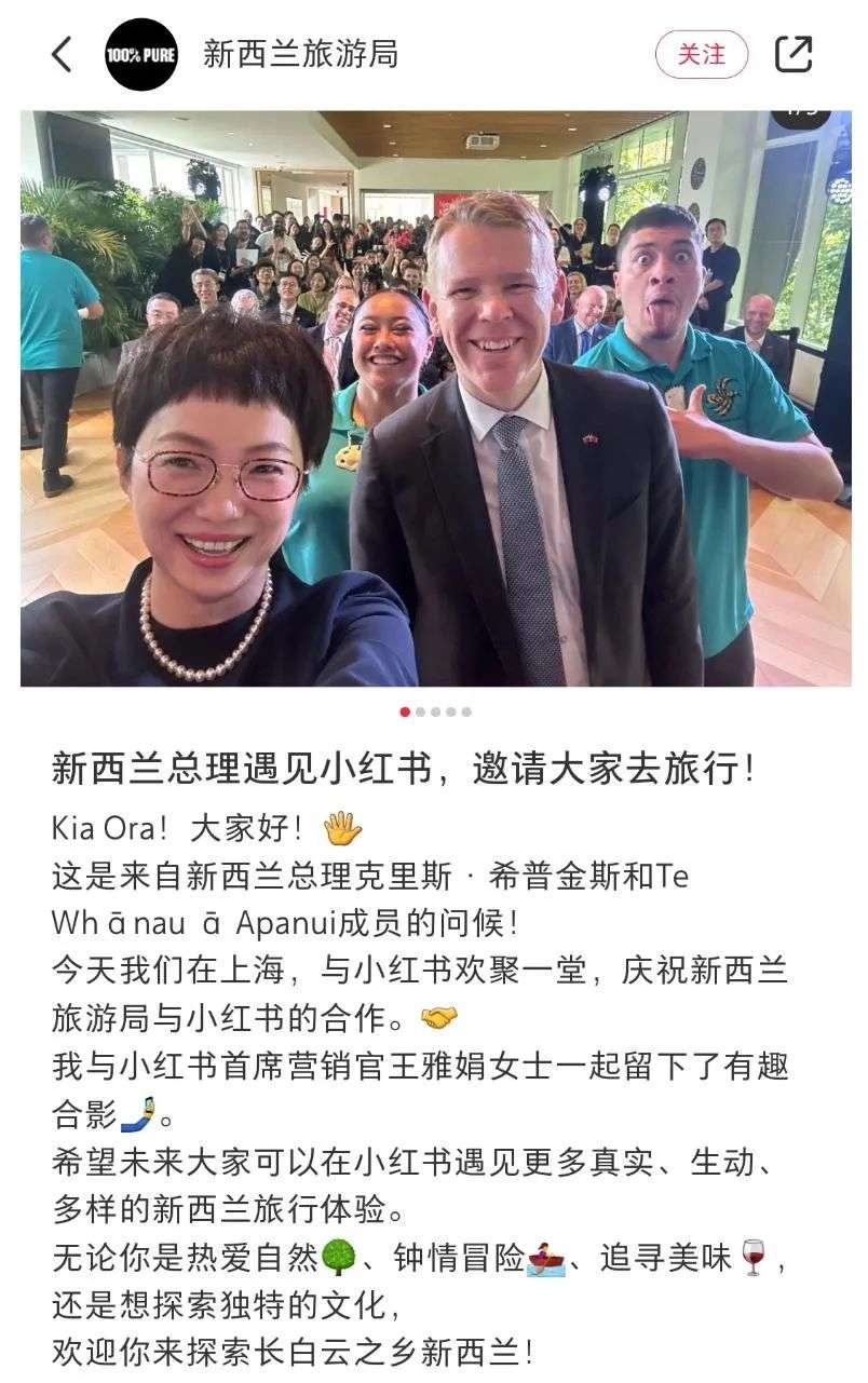 然后,贴到了新西兰旅游局的小红书账号上,在标题上写道:“新西兰总理遇见小红书,邀请大家去旅行!“