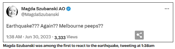 澳洲演员Magda Szubanski是第一个在网上发表关于地震反应的人,她发推文说:“地震???又来了??墨尔本的朋友们??”