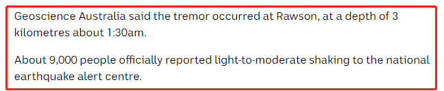 根据澳洲地球科学局(Geoscience Australia)的数据显示,这一次地震的震源深度为地下3公里。