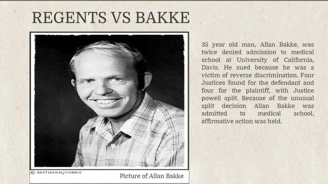 1978年的"巴克案"是反对"平权运动"的第一个案件。巴克是一个白人男性,连续两年被一个医学院拒绝录取,于此同时这个医学院根据16%黑人学生的定额制,录取了一些各方面条件都比巴克差的黑人学生。巴克一气之下上诉到美国最高法院。最高法院裁定对对黑人学生实行定额制是违宪的,但仍然在原则上支持"平权行动"。
