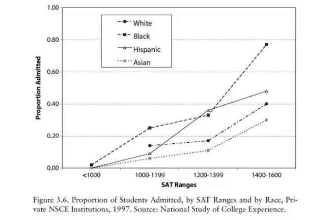 上图显示,不管哪个分数区间,亚裔学生的录取分数线都是最低的