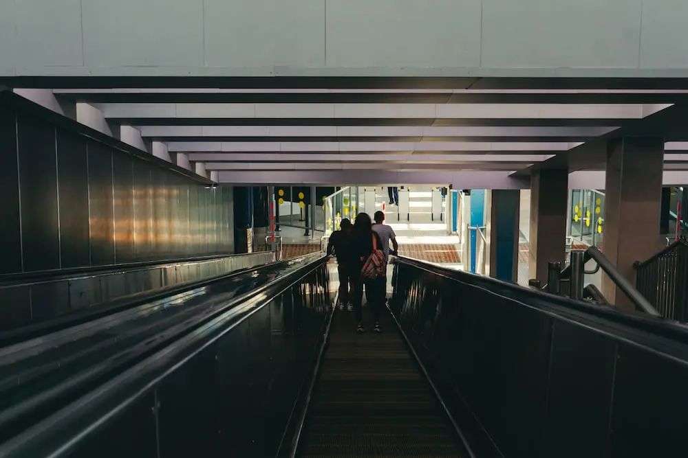 一位母亲带着2岁的孩子乘坐自动扶梯下楼。
