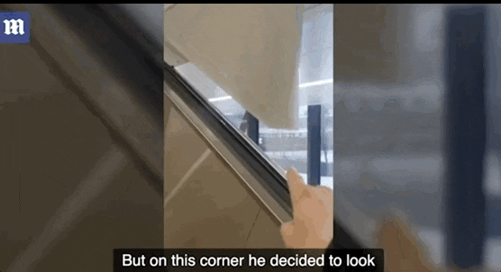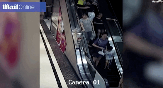 当时,11岁的男孩儿Misha和爸爸正一起坐扶梯。