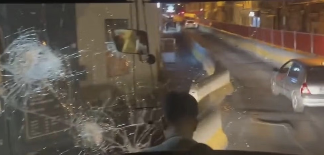 司机当时还比较淡定,试图继续开车,但暴徒越来越多,开始用围栏试图阻拦车辆前进,在挡风玻璃被砸的很严重的情况,司机掉头快速离开了危险区域。