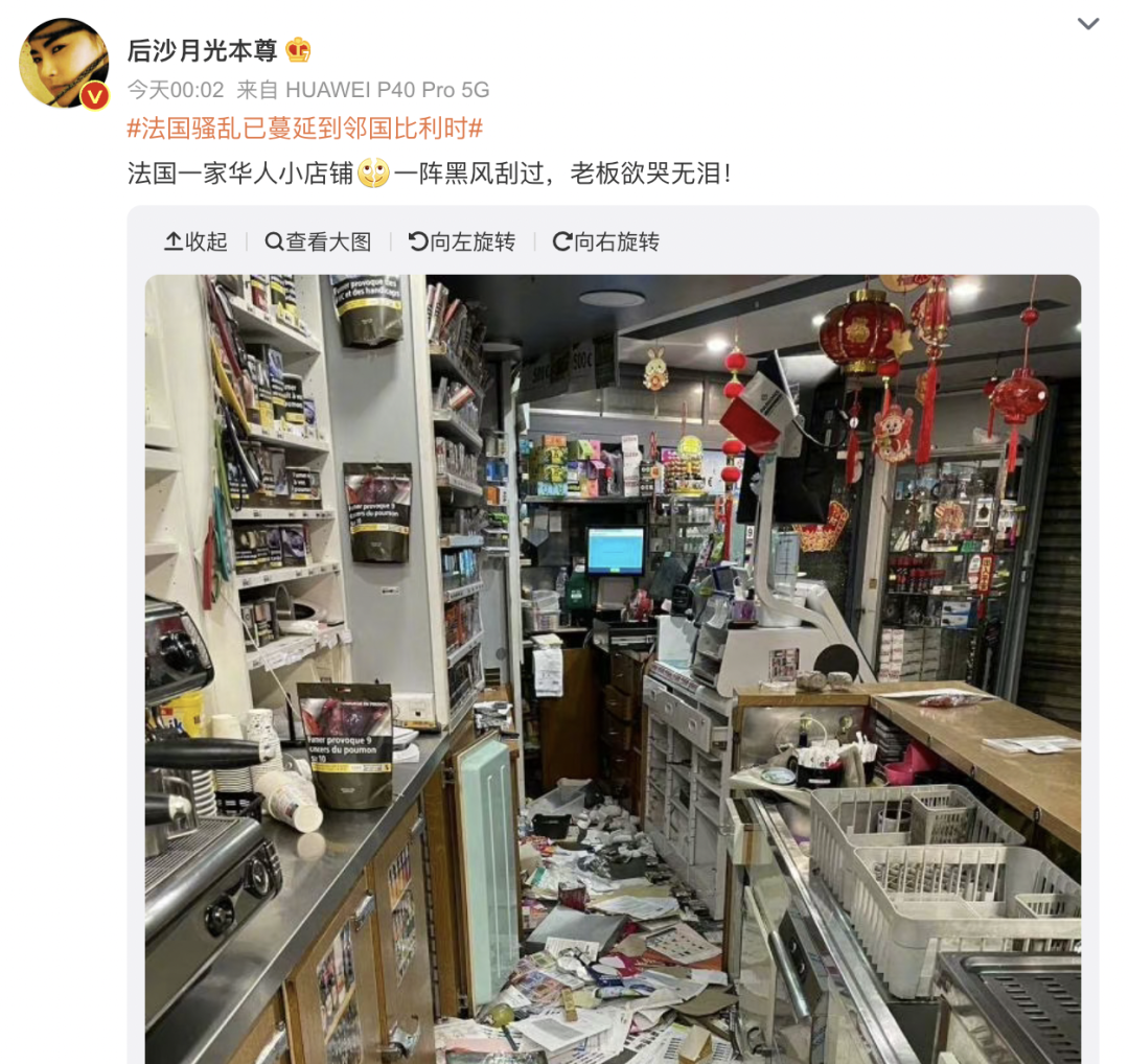 而法国持续数日的暴乱也已经波及到了当地华人社区,有网友晒出图,不少华人的店铺也遭到暴徒“光顾”,现场一片狼藉。