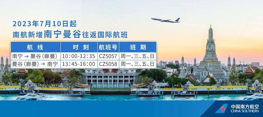 7 月 10 日起,南宁—曼谷开航,每周四班。具体航班信息见下图: