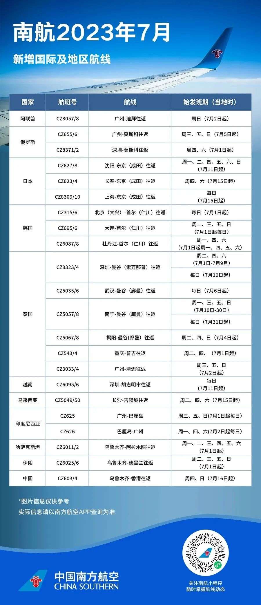 自 7 月起,南航本月新增国际及地区具体航线如下: