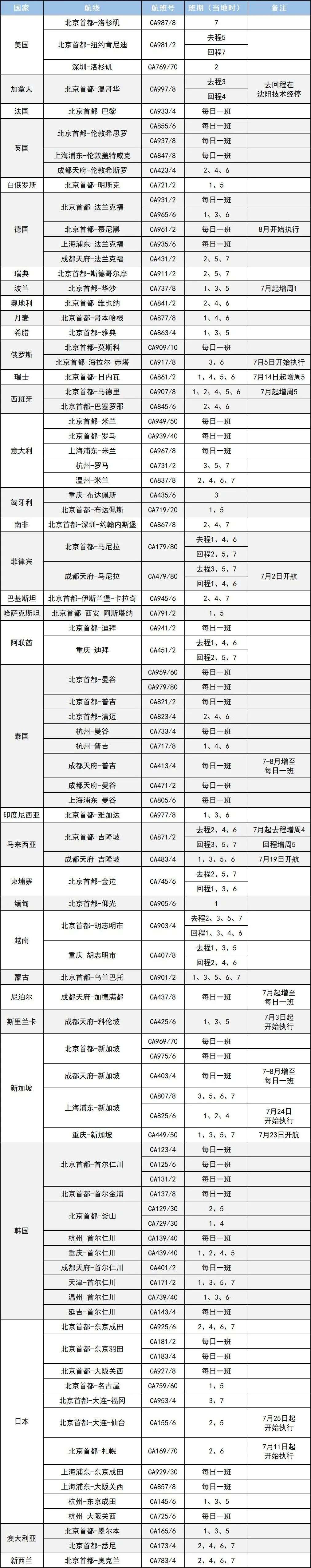 从7月起,国航陆续新开成都天府-马尼拉、成都天府-吉隆坡、重庆-新加坡航班,恢复成都天府-科伦坡、北京首都-海拉尔-赤塔、北京首都-札幌、北京首都-大连-仙台航班运行,增班北京首都-马德里、北京首都-华沙、北京首都-日内瓦、大连-香港、成都天府-加德满都、成都天府-普吉、成都天府-新加坡、成都天府-香港、成都天府-台北、重庆-台北航班,带给旅客更多出行选择。