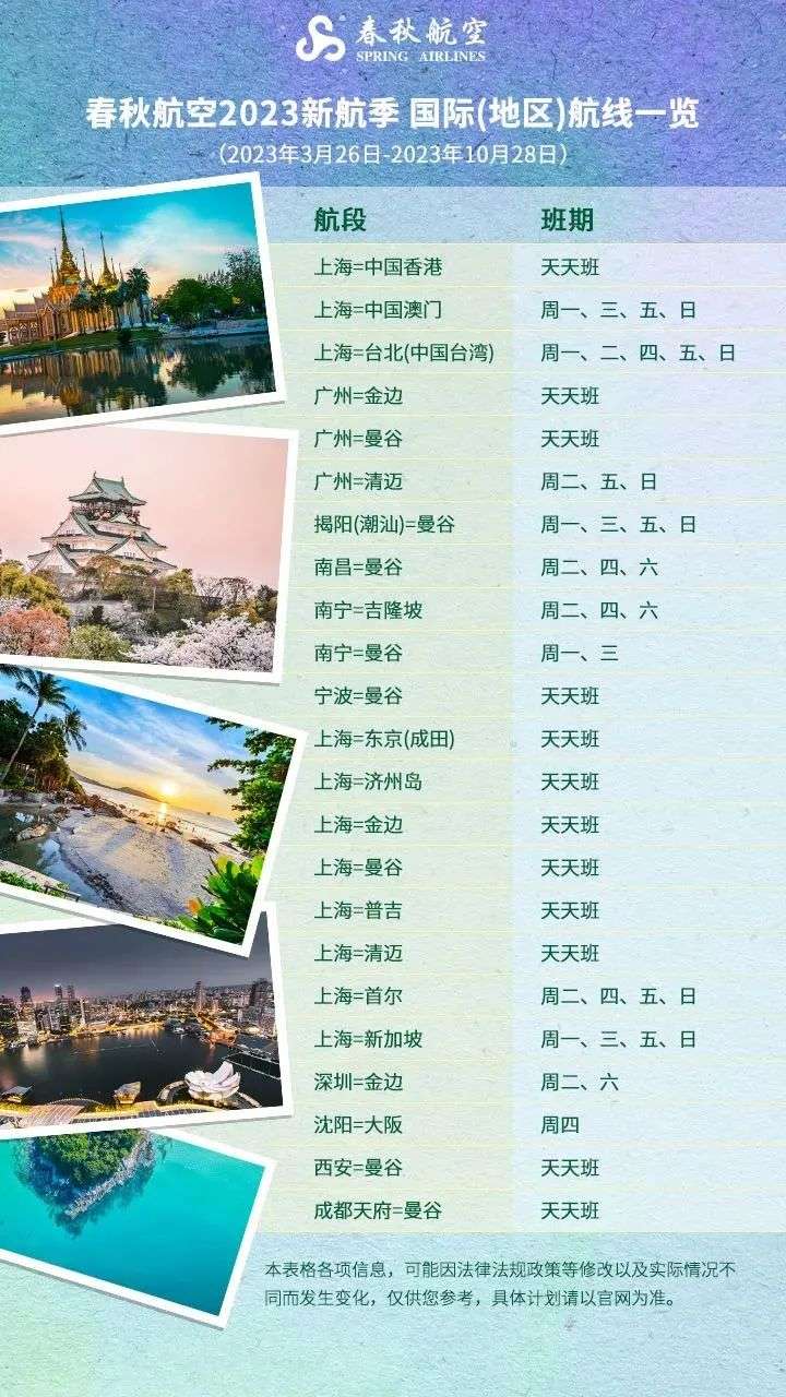 新航季,春秋航空国际/地区航线具体时刻表如下: