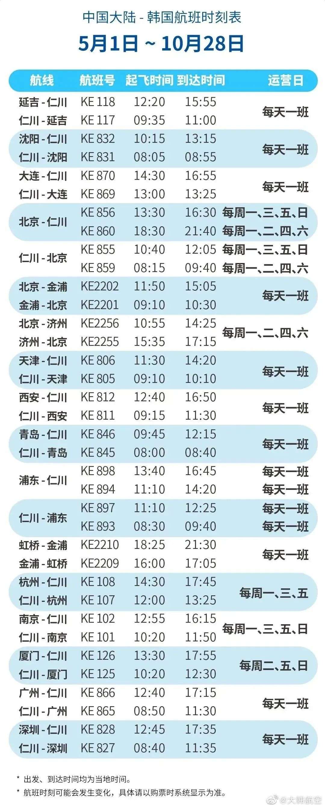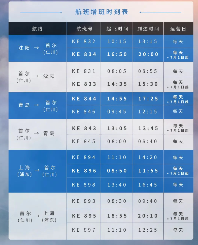 7 月起,大韩航空沈阳至首尔航班增至每天 2 班;青岛至首尔航班增至每天 2 班;上海浦东机场至首尔仁川机场航班增至每天 3 班。