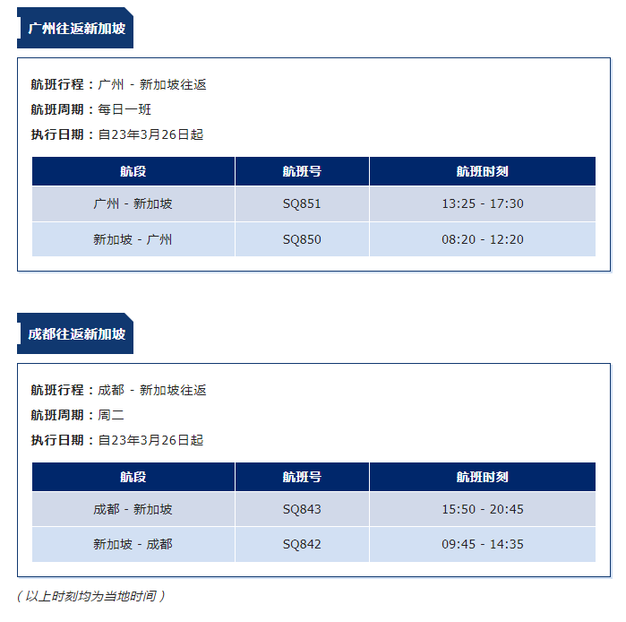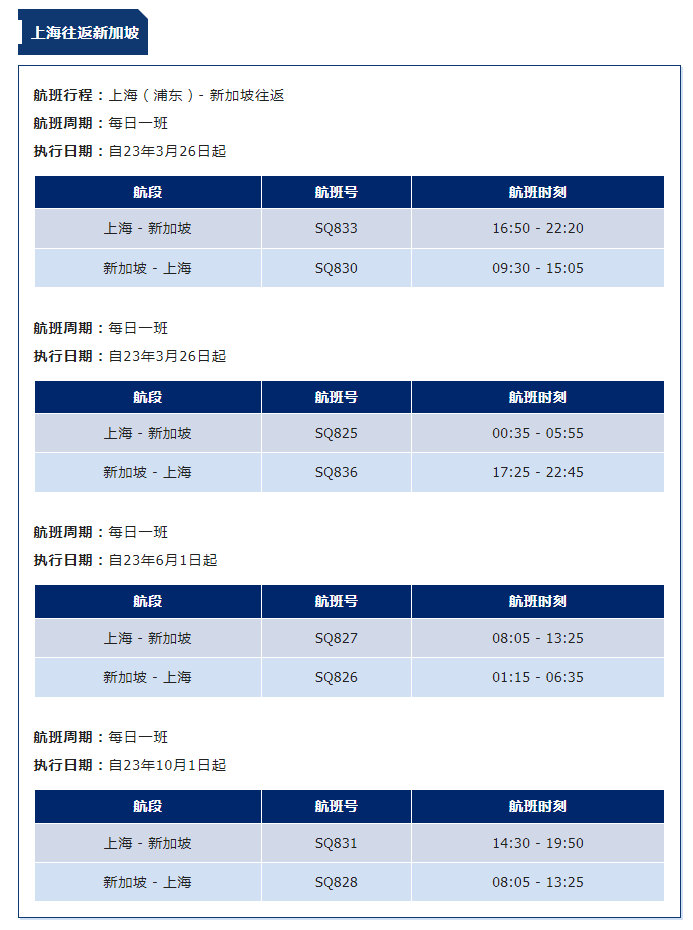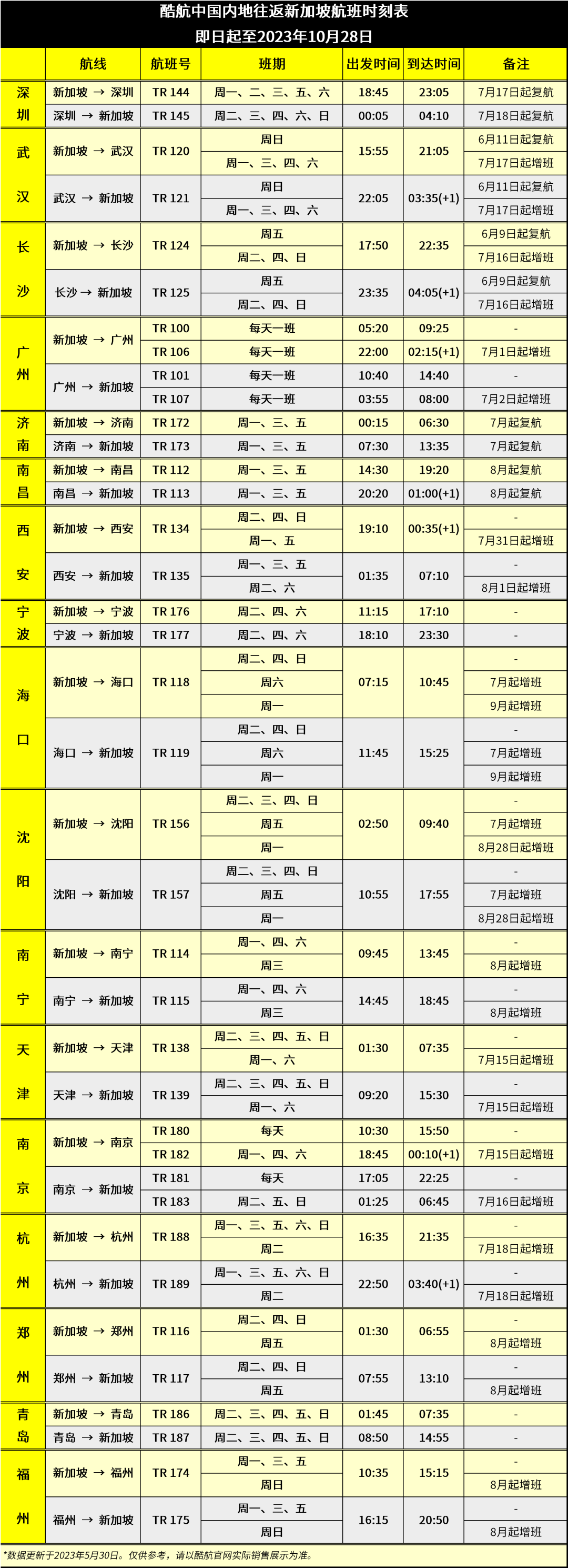 新加坡航空将于 23 年夏秋航季(自 23 年 3 月 26 日起),运营以下中国内地往返新加坡的航班计划: