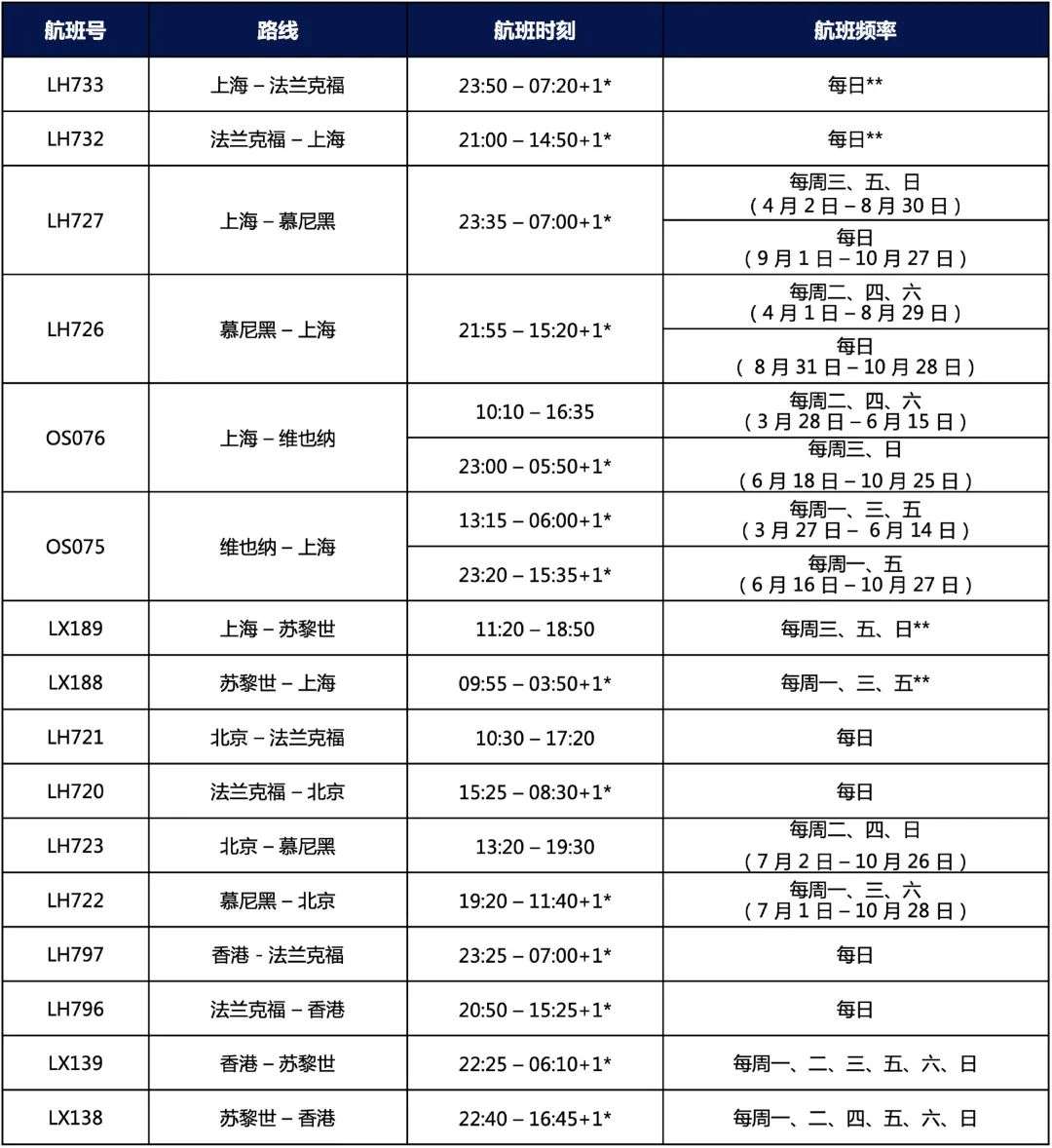 汉莎航空集团夏季航班时刻表,包含 2023 年 3 月 26 日至 2023 年 10 月 28 日的航班信息,往返中国大陆航班进一步加密中: