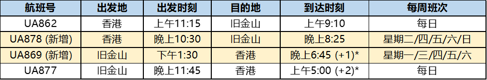 新增航班 UA878 将于每周二、四、五、六、日晚上 10:30 从香港出发,并于旧金山当地时间同日晚 8:25 抵达。回程航班UA869将于每周一、三、四、五及六下午 1:30 出发,于旧金山当地时间的次日晚 6:45 到达香港。