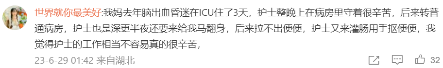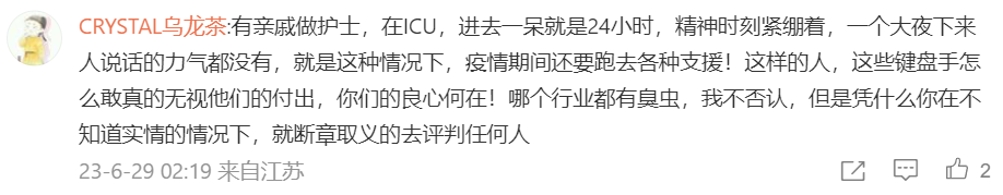 有亲戚做护士,在ICU,进去一呆就是24小时,精神时刻紧绷着,一个大夜下来人说话的力气都没有,就是这种情况下,疫情期间还要跑去各种支援!这样的人,这些键盘手怎么敢真的无视他们的付出,你们的良心何在!哪个行业都有臭虫,我不否认,但是凭什么你在不知道实情的情况下,就断章取义的去评判任何人