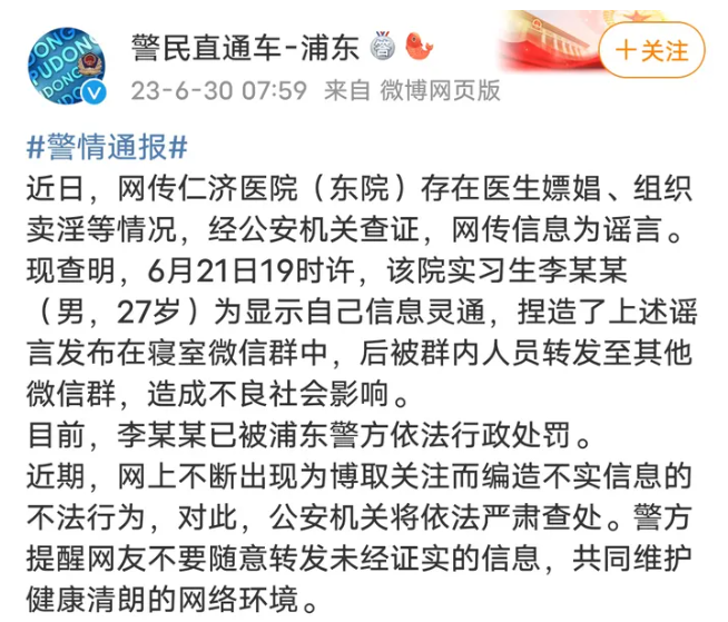 一名济仁医院的实习生李某某,为了显示自己信息灵通,恶意捏造了上述谣言,并发布在了寝室微信群中。