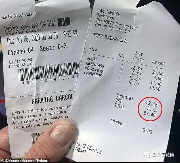 澳洲广播公司的记者Norman Hermant在墨尔本的Hoyts电影院观赏《夺宝奇兵》新电影后,在社交媒体上分享了他的收据照片。