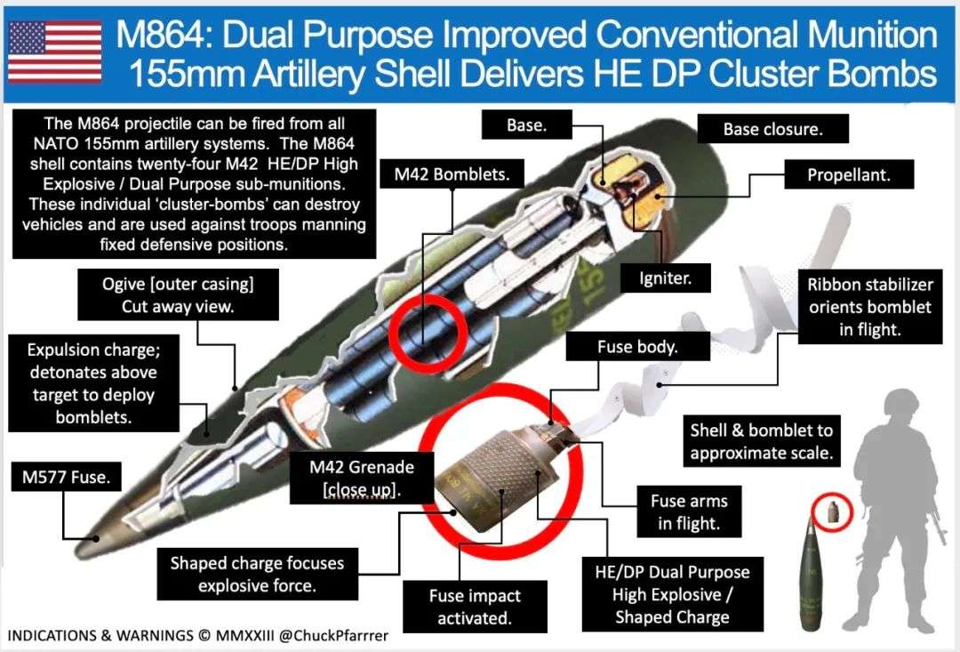 此次美国向乌克兰提供的是155毫米M864集束炮弹,该型炮弹于1987年起服役美军。可由美国和其他西方国家提供给乌克兰的155毫米口径榴弹炮发射。根据五角大楼的评估,此型号炮弹的“哑弹率”不高于2.35%,但在20年前的公开评估中,五角大楼曾表示,该型号的炮弹的“哑弹率”为6%,即在每枚炮弹所携带的72枚子炮弹中,至少有4枚不会爆炸。