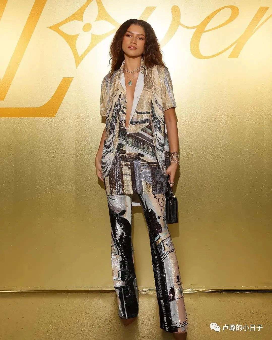 “时尚宠儿”赞达亚也现身了秀场,这次穿了LV2024早春系列印花衬衫套装,佩戴宝格丽绿宝石珠宝项链。