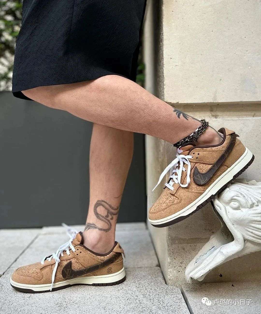 真要说他这身跟LV有什么关联,那就得看鞋子了。来自他创办的潮牌CLOT和NIKE的联名合作,CLOT x Nike Dunk Low 「软木塞」。再细看,“钩子”直接换成了LV Swoosh,还在小腿围上LV黑白雕花项链,贵都贵在细节。