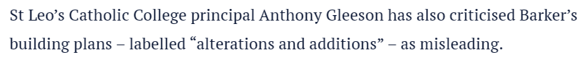该校是一所天主教小学,位于悉尼上北岸的Waitara,距离Barker College仅“一墙之隔”。在2022年的NAPLAN考试中,该校取得了541.2分的平均成绩,在新州排名第168名!2023年该校的学费为:学前班-6年级,$4311。此外,St Leo’s Catholic College的校长Anthony Gleeson也批评了Barker的扩建计划,称其将该计划标记为“改建和增加”,Gleeson说:“投资1.21亿澳元用于校园内的一些重要建筑,这绝不是小规模的改变。”而且“这项计划不仅会对环境造成影响,例如该区的交通和运输限制,最终也会影响St Leo’s Catholic College和Our Lady of the Rosary Catholic Primary School的学生入学率。”St Leo’s Catholic College简介: