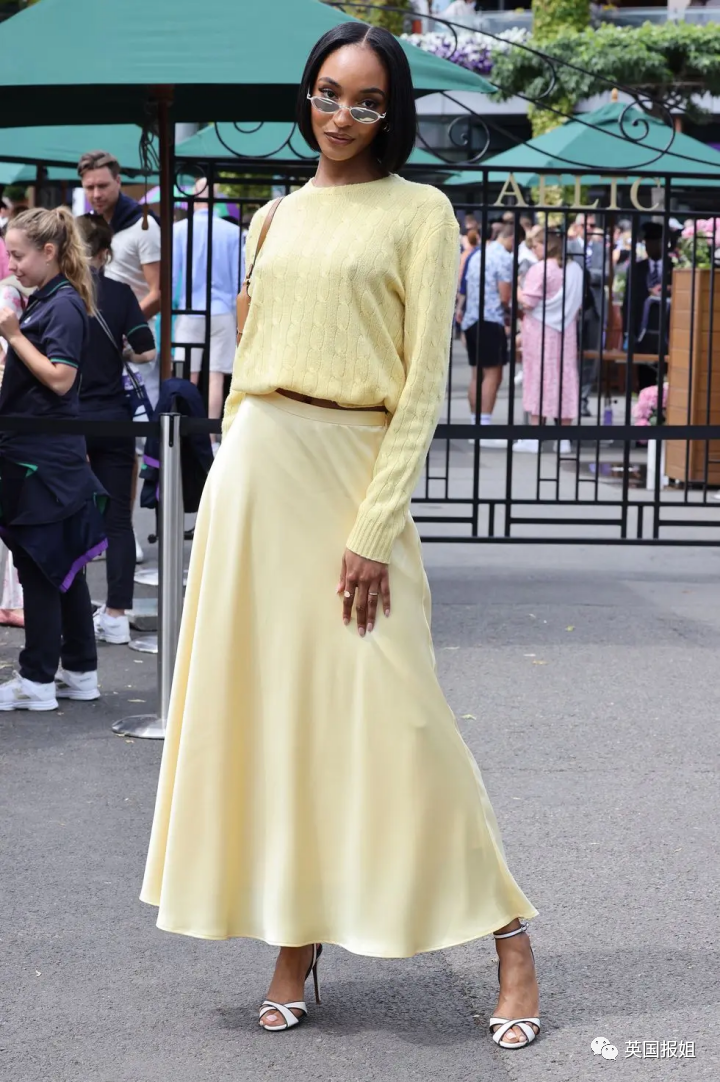 Jourdan Dunn穿了黄色拉夫·劳伦针织衫搭配同色丝绸裙子,一套衣服看上去普通,但穿在她身上就很惊艳,果然超模穿啥都好看。