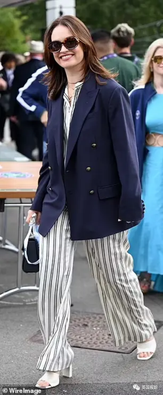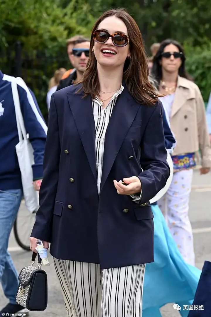 灰姑娘Lily James穿着海军蓝西装外套,搭配条纹连体裤。