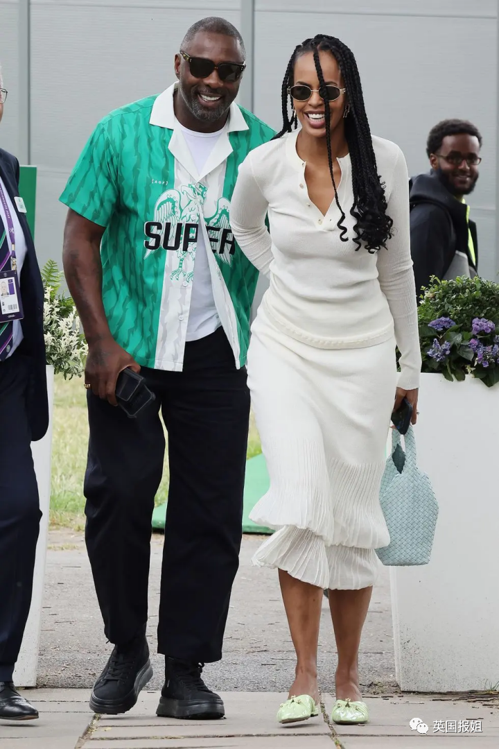 模特Sabrina 一袭白衣就足够亮眼,绿色的鞋子和丈夫Idris Elba的夹克相辅相成,活泼又清新。