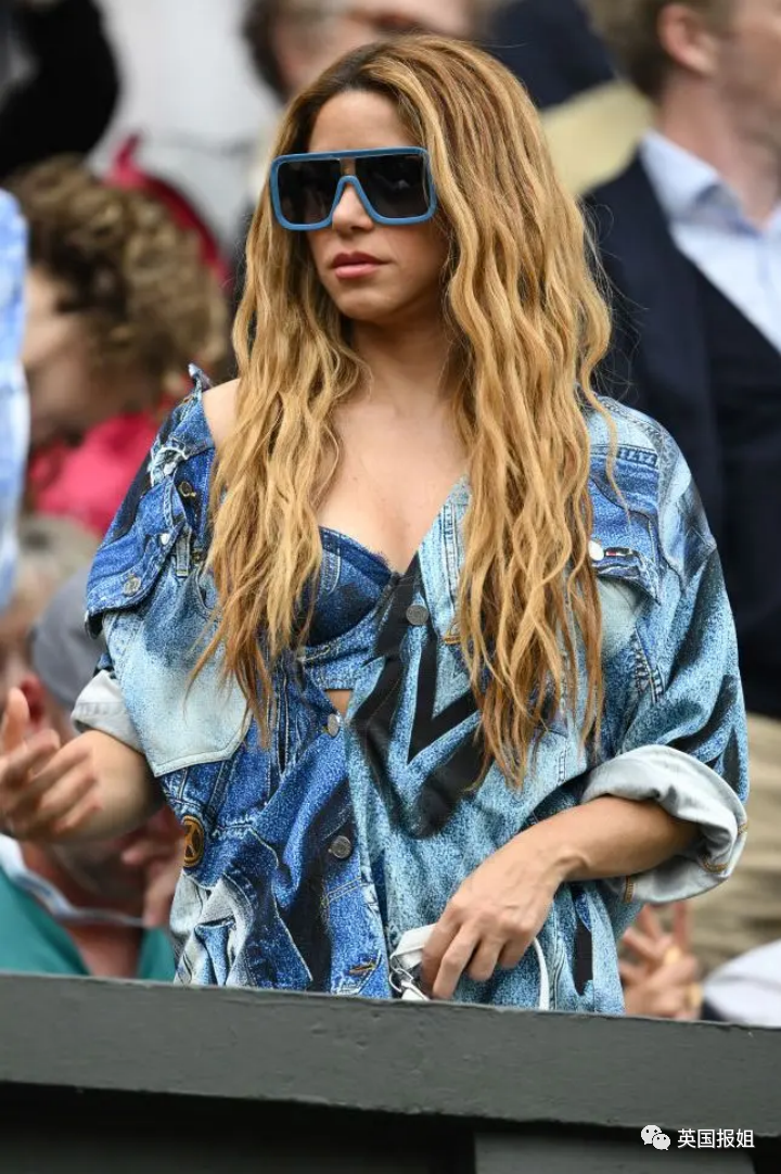 狼姐夏奇拉则穿着性感的牛仔装,搭配蓝框眼睛,在观众席上也那么火辣。