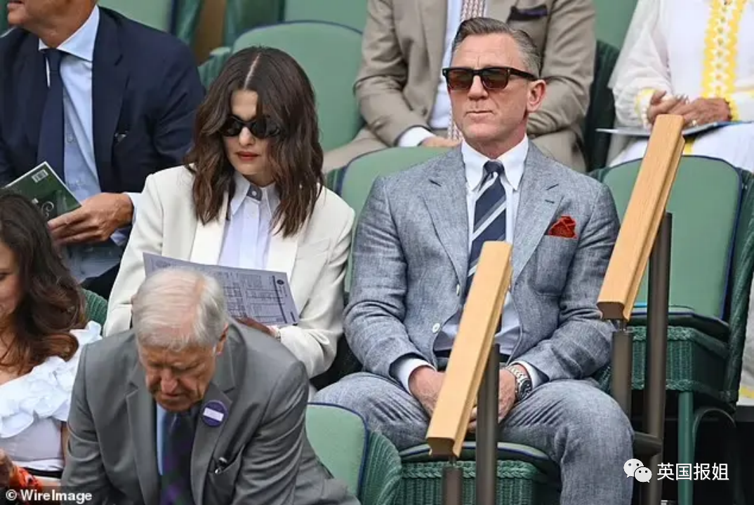 “007”丹叔和妻子蕾切尔·薇兹(《木乃伊》女主)靠在一起看球。蕾切尔穿着中性化的奶油色西装,墨镜一戴,非常酷炫。