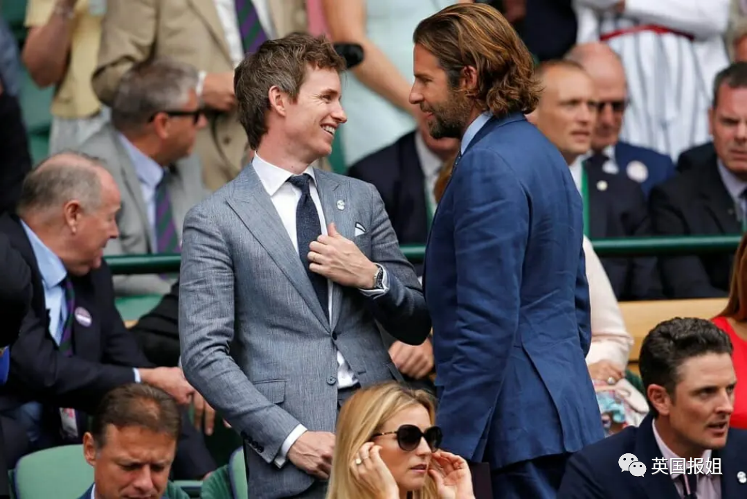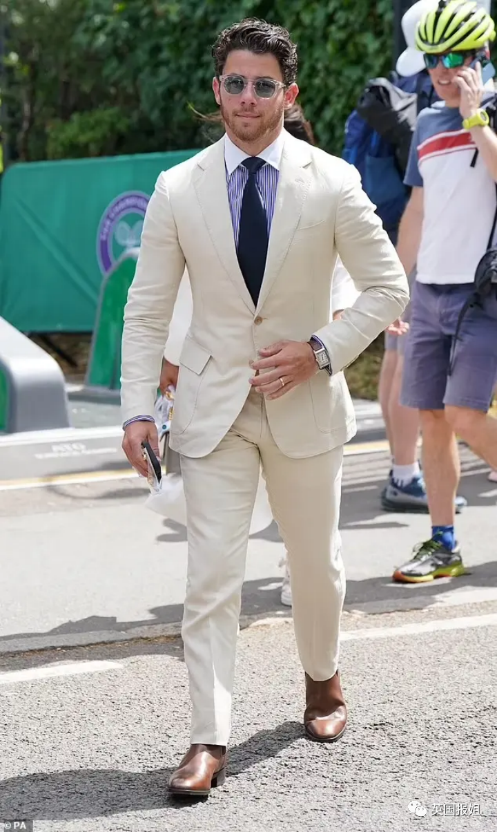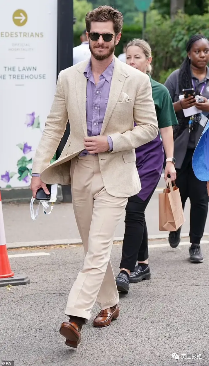 加菲则穿着米色休闲西装,衬衫是代表着温网的紫色,果然英国男人比穿西装的话就没输过。