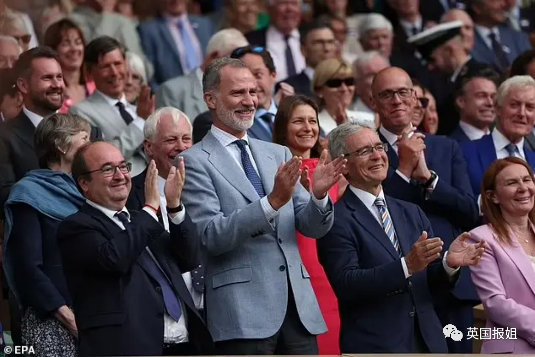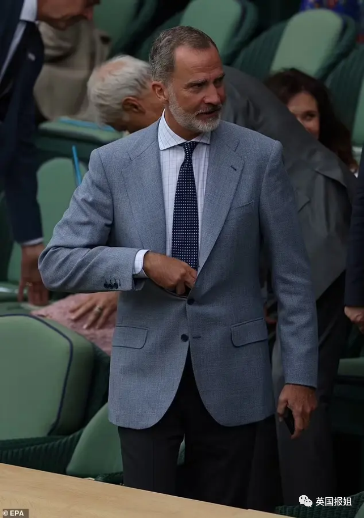 如果你喜欢看西装男,那温网是个饱眼福的地方。男单决赛上,西班牙国王费利佩六世特地飞来支持本国的选手。费利佩穿着一身笔挺的灰色西装,搭配格纹白衬衫,显得十分郑重。