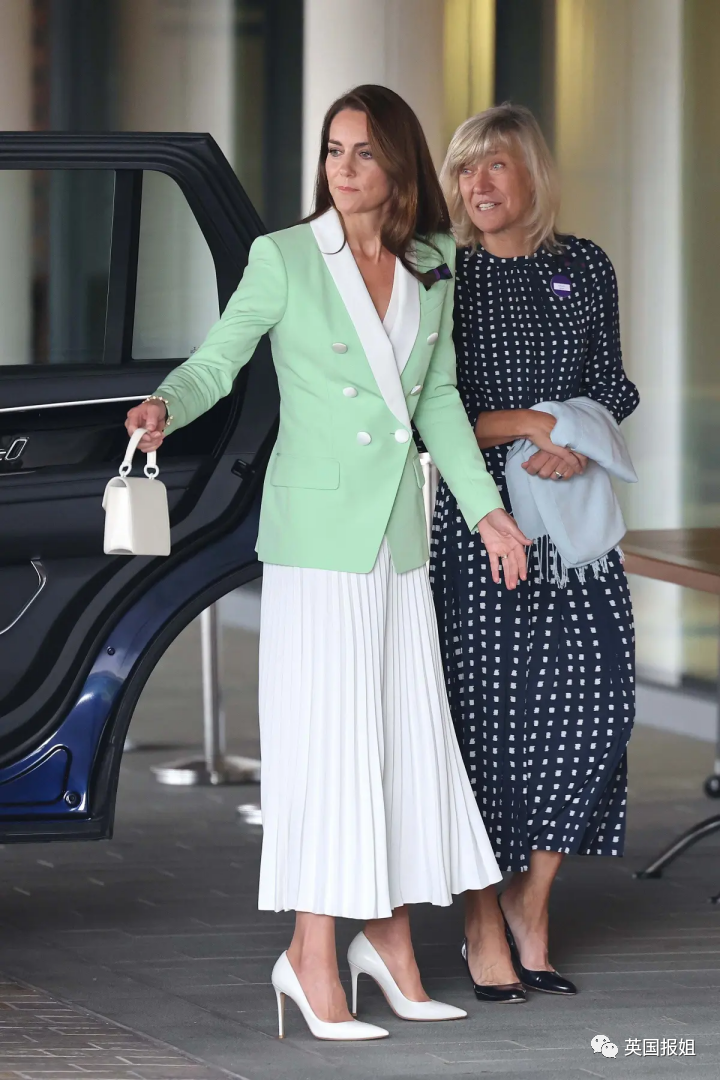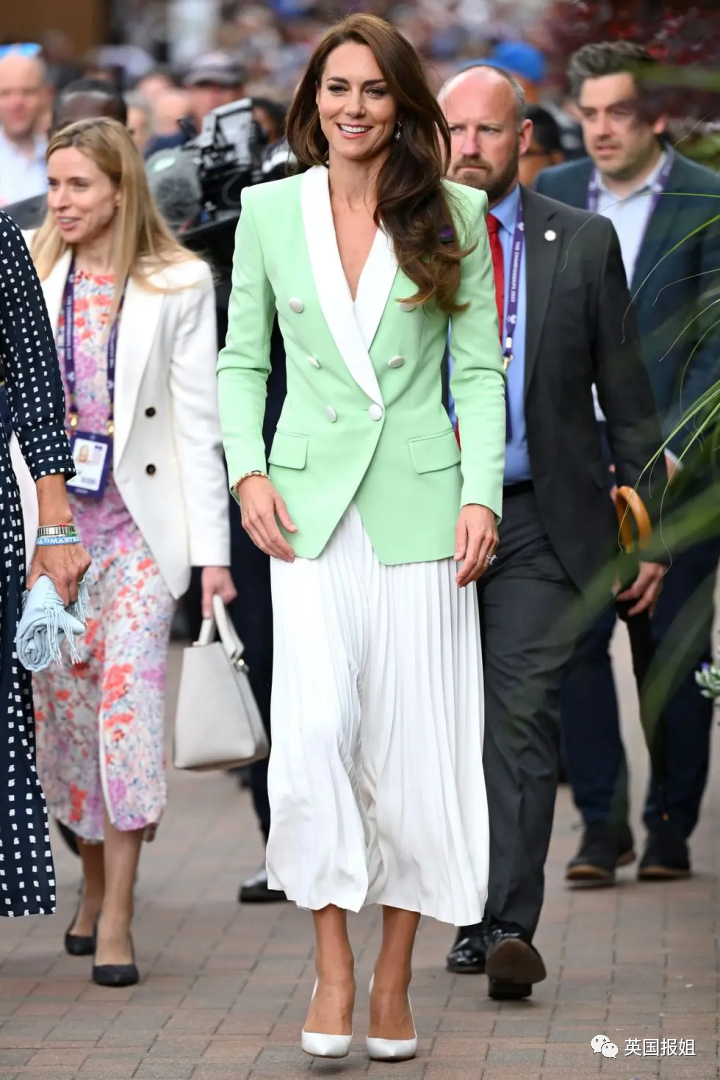 相对而言,凯特第一天亮相温网的西装外套+百褶裙搭配,就显得更靓丽潇洒一些。这是凯特这么多年来第一次穿法国品牌Balmain的衣服。
