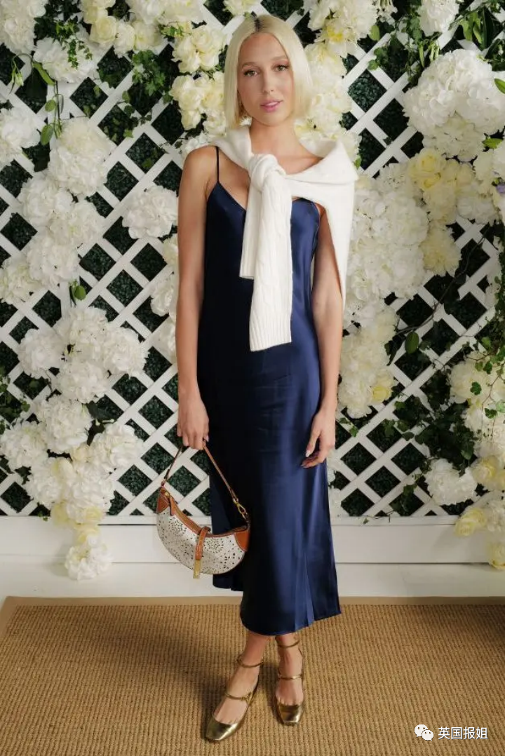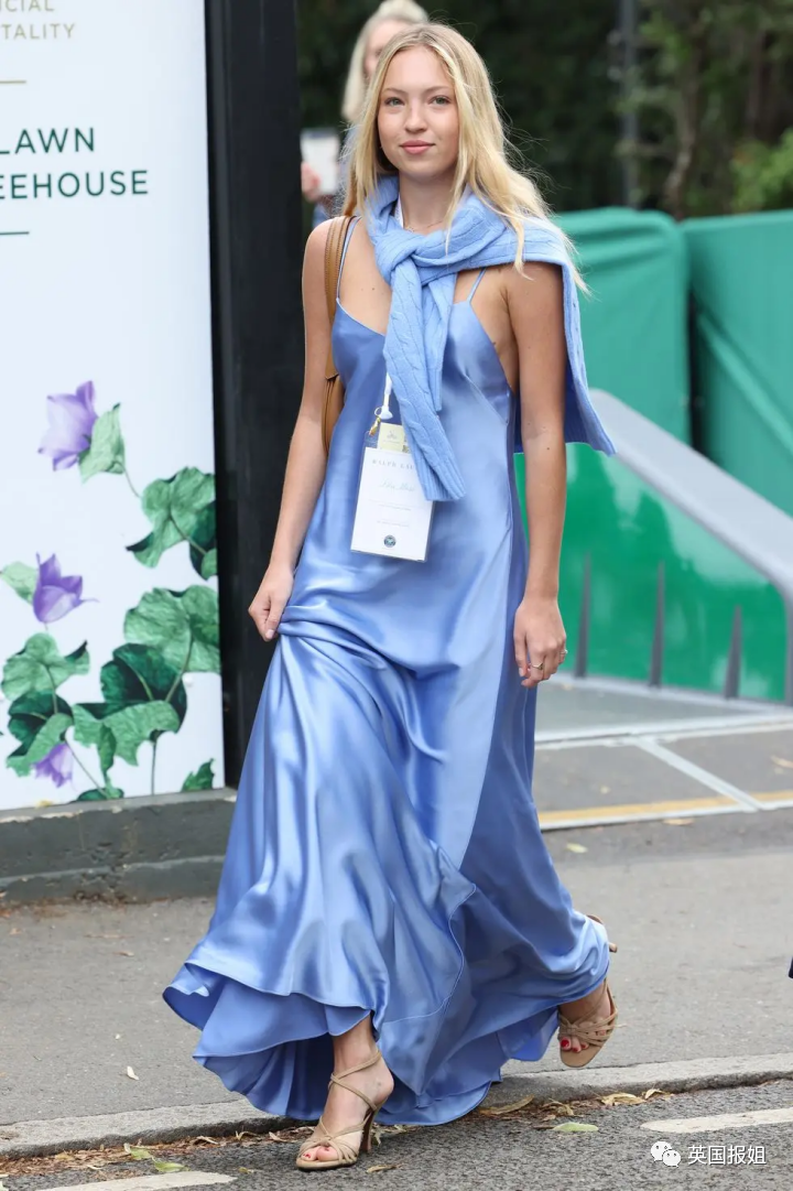 浅蓝色也是去看温网的好选择。超模kate moss的女儿Lila穿着丝质的拉夫劳伦吊带裙,搭配了同色的针织毛衣披肩,诠释温婉英伦风。