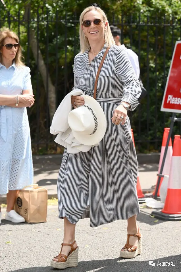 安妮公主的女儿Zara穿着条纹衬衫裙,拿着温网观众不可或缺的时尚单品——平顶草帽,大步走进会场。