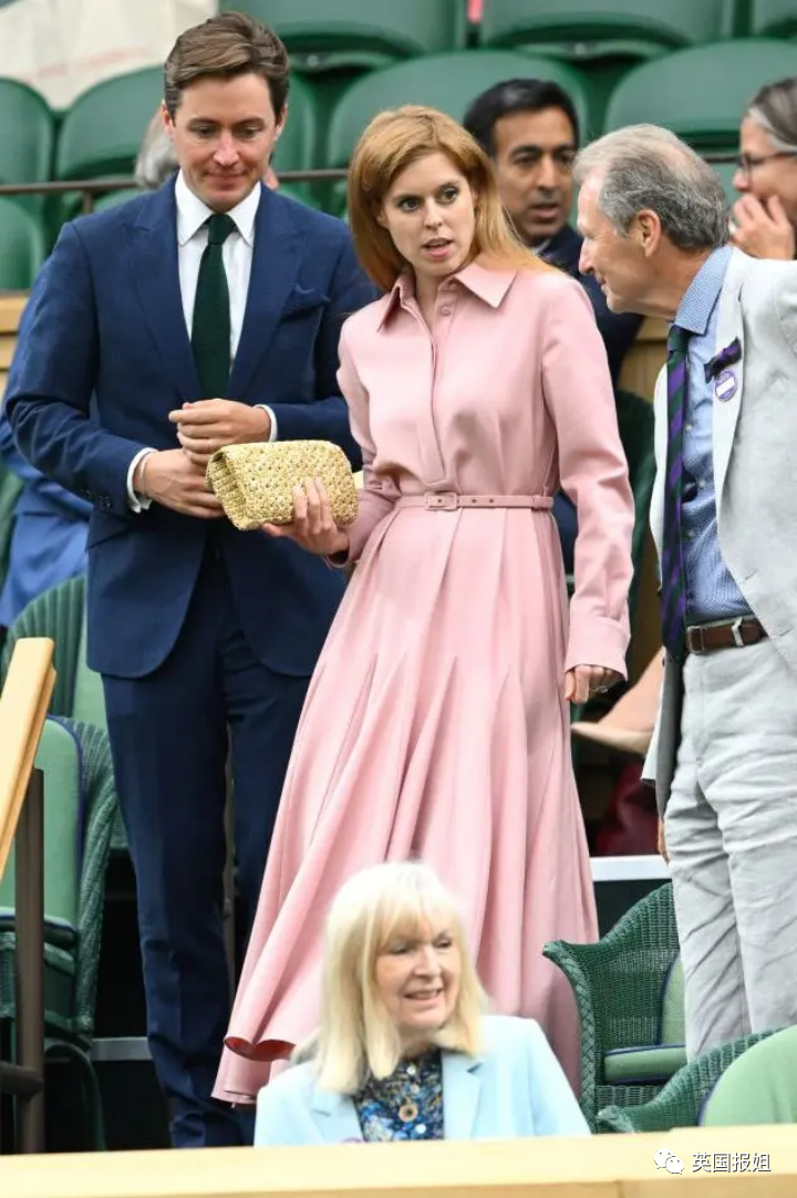 我们再看看今年其他王室成员的穿搭。安德鲁王子的大女儿碧翠丝公主和丈夫粉蓝搭配,瘦了不少的碧翠丝这身粉色连衣裙简单但十分优雅。