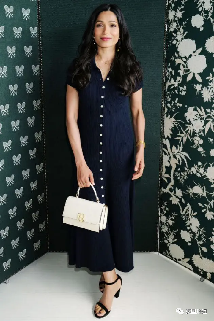 《贫民窟的百万富翁》和《猩球崛起》女主角Freida Pinto的穿搭也是极简美学,一件系扣连衣裙,白色包包完美搭配扣子的颜色,低调奢华。