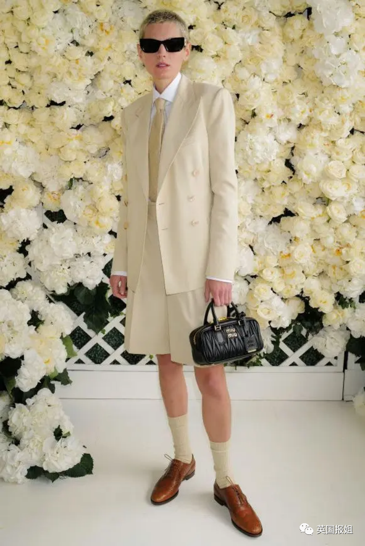 另一位艾玛,在《王冠》里饰演戴安娜王妃的艾玛·科林,则穿着拉夫劳伦的短裤西装套装,黑色的miumiu手包搭配墨镜。一如既往地坚持着她中性小男孩风格的穿搭。