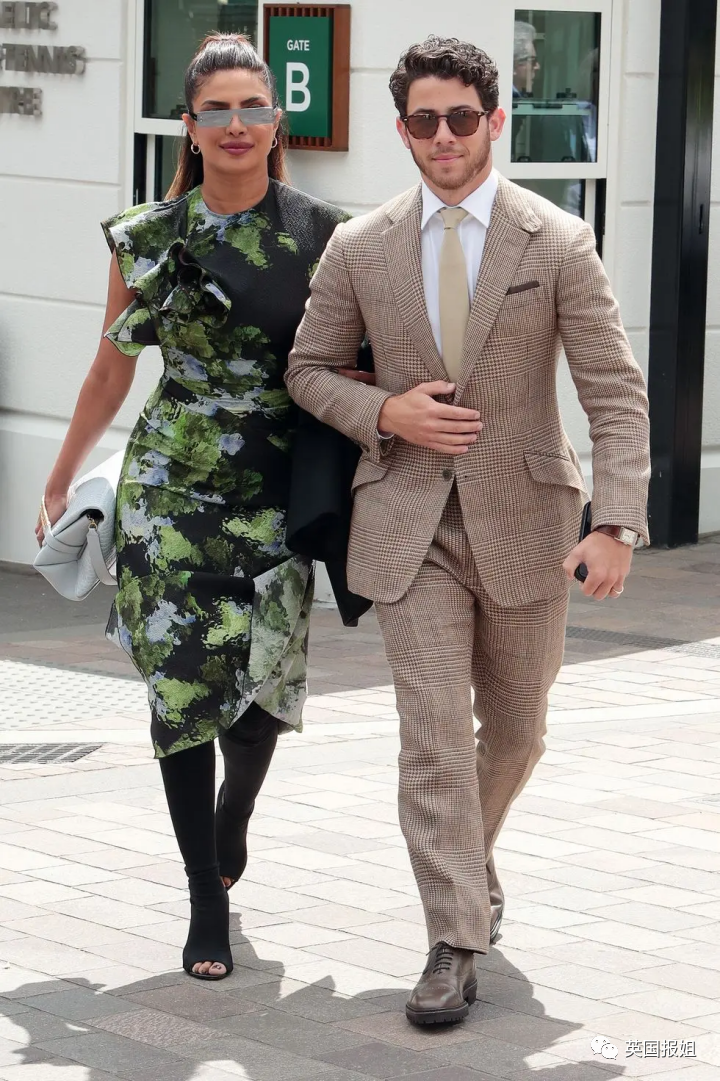 Priyanka穿着维多利亚·贝克汉姆品牌的连衣裙,低着酷炫的墨镜,小乔则穿着一身棕褐色格子西装,全身都有棕色元素,让人看着很舒服。