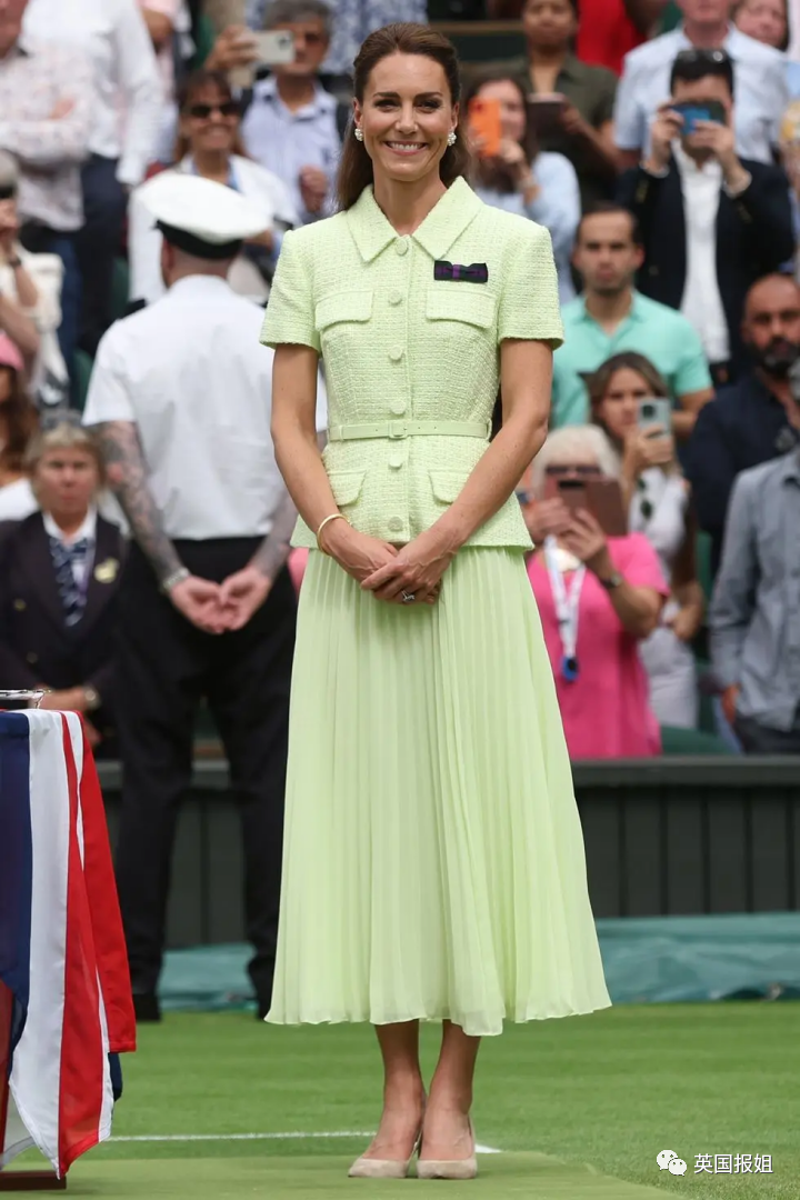 凯特此次在温网的穿搭上演了帽子戏法,三套裙子全都选择了清新的绿色系。男单决赛上她穿了设计师 Roland Mouret的祖母绿连衣裙,胸口夹着紫色的小蝴蝶结。