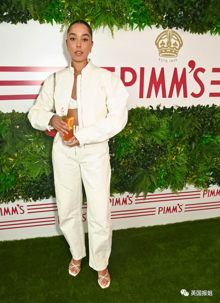 同样选择了白色系穿搭的还有大热古装剧《布里奇顿》的女演员Charithra Chandran。拉夫·劳伦的条纹连体裤十分符合网球赛的气质。