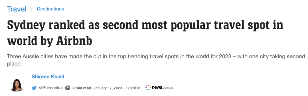 根据Airbnb发布的数据,悉尼是2023年世界上第二好的旅游目的地,墨尔本紧随其后排名第三,奥克兰排名第四。珀斯也首次上榜,排在第九位。