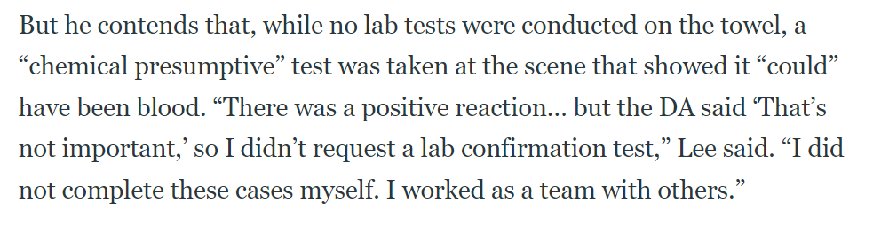 更重要的是,调查人员发现的化验单显示,在审判时 "已经明确知道该物质 "不是人血"。温伯格的律师达西·麦格劳称,在 1988 年的审判中,李昌钰 "面前 "有化验单,上面清楚地写着刀上的物质不是人血。但他庭审时并没有说出这一点。