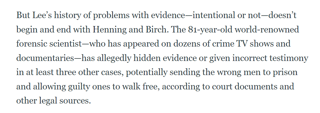 其实,这不是李昌钰第一次陷入证据争议的案件中,《thedailybeast》报道指出,李昌钰至少在其他三起案件中隐藏了证据或提供了错误的证词,有可能将无辜的人送进监狱,让有罪的人逍遥法外。